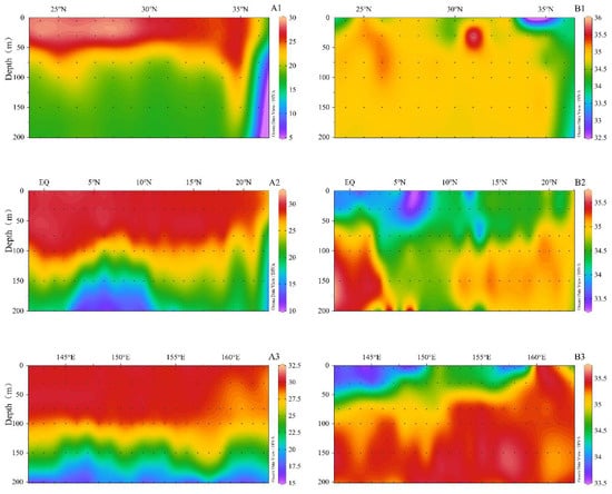 The transection distribution of temperature (°C) and salinity. (A1–A3) represents the temperature of S1, S2, and S3 and (B1–B3) represents the salinity of S1, S2, and S3.