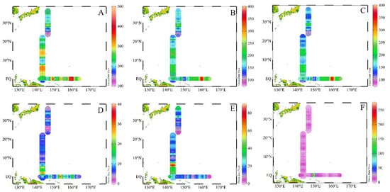 The horizontal surface distribution of zooplanktons in the survey area (ind./m3). (A–F) Species abundance, Arthropoda, Copepods, Chaetognaths, Chordata, and Larvae.