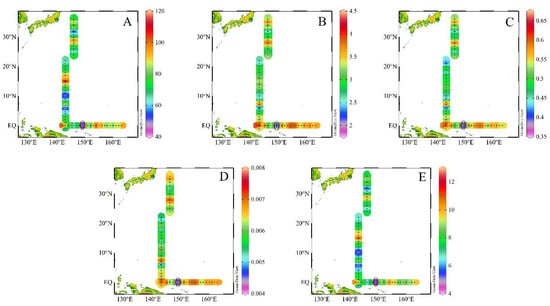 Different indices of biodiversity can express the diversity of a zooplankton community or assemblage in different ways, but the best way to evaluate the diversity of a community is to use these indices in combination []. In general, from the five selected diversity indices, the species richness has the same trend as the Margalef index, providing an initial indication of the diversity of communities in the surveyed sea area. On the other hand, the values of diversity index (H′) and Pielou’s Evenness Index (J) showed similar distribution. For instance, as shown in Figure 5, at stations ST0734 and ST0735, the values of S and Dm are modest and in the middle of the range, whereas H’, J, D, and abundance were higher. On the contrary, although the species density was high at ST0315 (Figure 5), all five parameters showed low diversity indices (circled in Figure 5), which was caused by the large enrichment of zooplankton larvae (especially copepod larvae) at this site. H′ and J reached maxima (4.40 and 0.65, respectively) at ST0742 in the eastern part of the equatorial section, indicating the stability of the ecosystem. However, there was no clear trend in the latitudinal distribution of zooplankton communities due to the complexity of the Western Pacific Gyre, especially the multiple and complex circulations that may be related to the oceanic environment in which they live. Overall, the community diversity at the equatorial section of the surveyed area was higher than the latitudinal sections.
