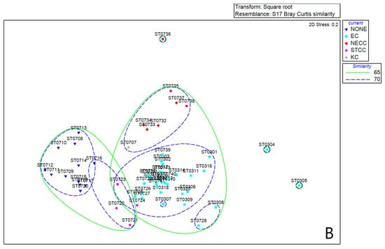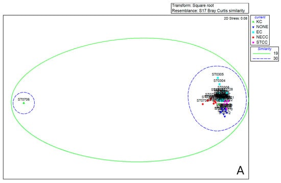 The results of the MDS analysis for all 59 samples are shown in Figure 6, in which station ST0706, affected by the KC, can be distinguished from the other stations according to a 30% similarity (Figure 6A). With the exception of station ST0706, the other stations were subjected to further MDS analysis, as shown in Figure 6B. Spatially, the zooplankton community group is more clearly influenced by the different circulations in the equatorial flow system when the similarity reaches 70%. The NECC group is clearly separate from the other groups, indicating that the zooplankton community structure of the NECC is significantly different from that of the other circulations. The STCC group is partially intersected with the EC group because both EC and STCC are flow systems with high transparency and STCC activity is reduced in the autumn []. The division of these groups indicates a strong link between zooplankton community structure and the circulation.