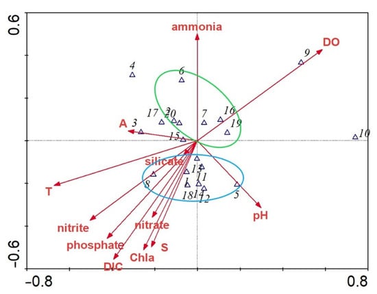 A canonical analysis of biotic and abiotic variables in the survey area. T represents temperature; S represents salinity; A represents total alkalinity; 1–20 are as follows: 1—Acartia negligens, 2—Canthocalanus pauper, 3—Cosmocalanus darwinii, 4—Nannocalanus minor, 5—Calocalanus pavo, 6—Clausocalanus furcatus, 7—Clausocalanus farrani, 8—Clausocalanus arcuicornis, 9—Lucicutia flavicornis, 10—Mecynocera clausi, 11—Acrocalanus gibber, 12—Acrocalanus gracilis, 13—Paracalanus aculeatus, 14—Paracalanus gracilis, 15—Paracalanus parvus, 16—Parvocalanus crassirostris, 17—Parvocalanus elegans, 18—Oithona plumifera, 19—Oithona setigera, and 20—Oithona similis.