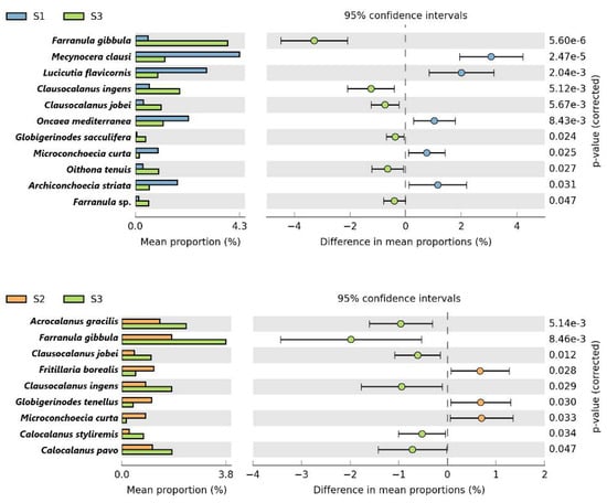 In terms of total abundance, the zooplankton abundance in S3 is higher than that in S2, and the lowest abundance is in S1. However, this does not reveal the difference in zooplankton community structure between the equatorial and latitudinal segments well. Therefore, we selected the species with more than 30% occurrence between 59 stations to compare the abundance between the two groups (S3 and S1, S3 and S2). A total of 11 species of zooplankton were significantly different in abundance when comparing S3 with S1, while nine species were significantly different when comparing S3 with S2. The results of the significant (p < 0.05) differences in abundance between the two groups are shown in Figure 8. In both sets of comparisons, there were significant differences in abundance between the four species: Farranula gibbula, Clausocalanus ingens, Clausocalanus jobei, and Microconchoecia curta. Of these, Farranula gibbula had the greatest difference in abundance in both comparisons, with much greater abundance in S3 than in the other two transects.
