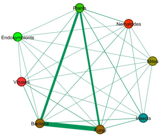 Number of publications with the keyword “biodiversity” indicated, for each node pair, by the edge thickness (data retrieved from PubMed, search period: 1947–2020; network produced with Gephi, https://gephi.org (accessed on 13 December 2020)).