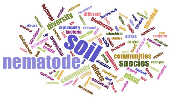 Most represented words in title and abstract of scientific papers with keywords “biodiversity”, “soil” and “nematode” in title and/or abstract, published during the last five years (source: PubMed, produced at https://www.jasondavies.com/wordcloud/ (accessed on 13 December 2020)).