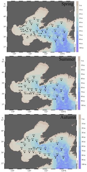 During 2019, we conducted three cruises in the BS and the NYS (37°–39.5° N, 118.5°–124.5° E) (Figure 1) and the BS and NYS were semi-enclosed shelf seas located in northern China: 12 to 24 April 2019, 8 to 18 June 2019, and 12 to 22 October 2019, representing spring, summer, and autumn, respectively. During these cruises, a total of 279 water samples in surface, bottom and bottom layers at 93 sampling stations were investigated.