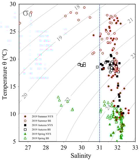 Temperature-salinity (T-S) relationship of sea water during three cruises (spring, summer, autumn) in the BS and NYS. A salinity of ~31 psu characterizes the coastal water system (dashed blue line), and x-axis is salinity, y-axis is temperature, and the isobars are density. NYS is the north Yellow Sea and BS is the Bohai Sea.