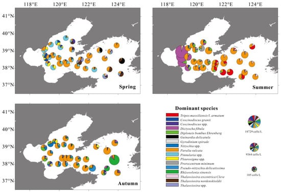 Pie charts of the top 15 dominant phytoplankton taxa in different seasons based on water column integration. The pie chart size is related to cell density as shown in Figure 3.