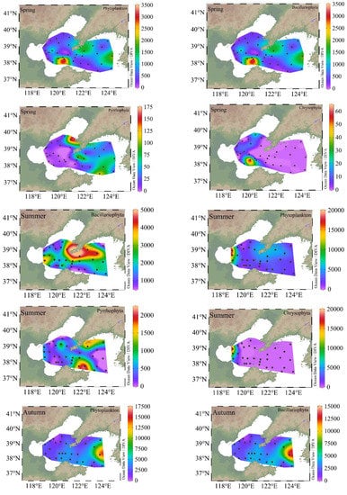 Sea surface distribution of phytoplankton, Bacillariophyta, Pyrrhophyta, and Chrysophyta (cells·L−1) in different seasons. The color bar is cell abundance.