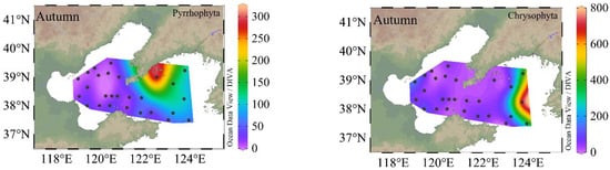 The sea surface distribution of phytoplankton, diatoms, dinoflagellates, and chrysophytas are shown in Figure 4. In the BS and NYS, the phytoplankton abundances ranged from 20 to 4.04 × 103 cells·L−1, and the diatoms accounted for 95% of the total phytoplankton abundance. The relative abundance of dinoflagellates was usually low, accounting for 4.5% of the total cell abundance. In summer, the phytoplankton abundance was highest, ranging from 20 to 7.70 × 104 cells·L−1, and consisted mainly of diatoms, dinoflagellates and chrysophytes. In autumn, the abundance of phytoplankton decreased ranging 20–2.91 × 104 cells·L−1. In autumn, similar to spring, the phytoplankton abundance was mainly dominated by diatoms. The highest abundance of phytoplankton was found in the NYS.