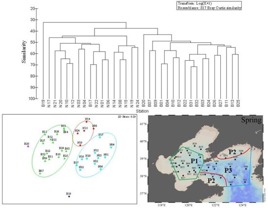 The phytoplankton community in the BS and NYS were divided into three ecological provinces in each season (Figure 5, Figure 6 and Figure 7) and the phytoplankton abundance and environmental parameters in the different ecological provinces during the three cruises were shown in Table 5. In summary, we defined the first provinces in three seasons as a province based on the distribution (in the BS) and defined it as P1. We defined the second province in three seasons as a province based on the distribution (in the coastal waters of the NYS) and called it P2. The third provinces (in the NYS) in three seasons were defined as a single province and we called it P3.