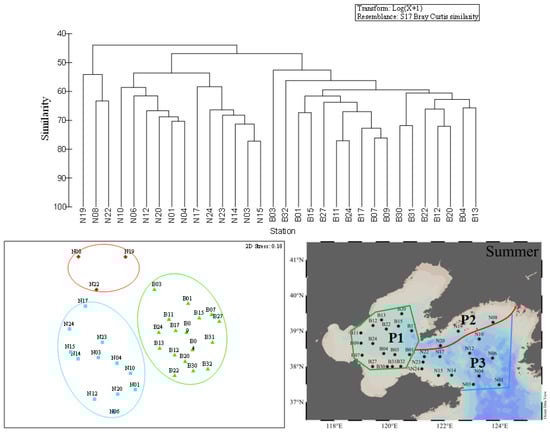 In summer, the first province was the same as the first province in spring and consisted by all stations in BS (Figure 6). The temperature and salinity were recorded with the mean values of 22.7 ± 3.8 °C and 31.3 ± 1.2, respectively. The general phytoplankton abundance was higher than other areas and varied from 1.40 × 102 to 7.70 × 104 cells·L−1, with an average value of 5.3 × 103 cells·L−1. Diatoms and chrysophytas accounted for 34.7% and 58.2% of the total phytoplankton abundance, respectively. The dominant species were mainly composed of P. sulcata, D. fibula, and Diploneis bombus. The second province had three stations (N08, N19, N22), as shown in Figure 6, similar to the second province in spring, and was scattered among the costal of the NYS (Figure 6). A total of 47 taxa of three phyla, involving 18 taxa of diatoms, 28 taxa of dinoflagellate, one taxon of Chrysophyta were observed. The mean values of temperature and salinity were 17.9 ± 6.1 °C and 31.6 ± 0.5, respectively. The total phytoplankton abundance ranged from 1.60 × 102 to 1.15 × 104 cells·L−1 and the mean value was 3.76 × 103 cells·L−1. Diatoms occupied about 73.0% of the total phytoplankton abundance and were dominated by P. sulcata, Pseudonitzschia delicatissima, Meuniera membranacea, Diploneis bombus, etc. The third province consisted of 12 stations in the NYS as shown in Figure 6. The temperature showed a drastic difference and varied from 6.9 °C to 27.4 °C. The mean values of salinity (32.0 ± 0.3) were relatively higher than other ecological provinces in summer. The total phytoplankton abundance ranged between 20 and 1.35 × 104 cells·L−1, with an average value of 2.59 × 103 cells·L−1. Diatoms accounted for 80.62% of the total phytoplankton abundance and were dominated by P. sulcata, Thalassiosira eccentrica, Tripos massiliensis f. armatus.