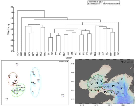 In autumn, the first province consisted of 12 stations, covering all stations in the BS and one station in the NYS just as shown in Figure 7. The mean values of temperature and salinity were 18.7 ± 0.6 °C and 31.5 ± 0.5, respectively. The total phytoplankton abundance ranged between 5.71 × 103 and 6.40 × 103 cells·L−1, with the mean value of 2.39 × 103 cells·L−1. The second province was composed of six stations and these stations distributed in the coastal area of the NYS. The mean values of temperature and salinity were 18.8 ± 0.4 °C and 31.3 ± 0.6, respectively. The total phytoplankton abundance ranged between 5.71 × 103 and 6.40 × 103 cells·L−1, with an average value of 2.39 × 103 cells·L−1. The third province had six stations locating in the NYS, as shown in Figure 5. The temperature ranged from 10.1 to 20.8 °C, with an average of 16.7 ± 3.6 °C. The average value of salinity was 31.9 ± 0.2. Diatoms were the most dominant phytoplankton group in these three provinces, and accounted for 97.8%, 97.6%, 94.2% of the total phytoplankton abundance, respectively. P. sulcata and D. bombus were the dominant species in these three provinces. In addition, B13, N4, and N19 could not be divided into any of the three provinces due to the composition of the top 15 species in these stations having an obvious difference.