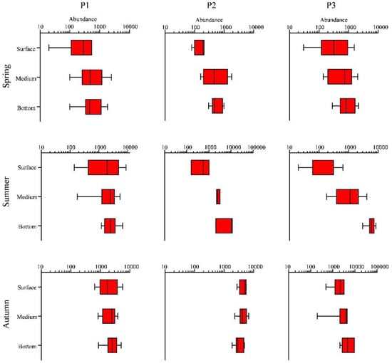 The vertical distribution of total phytoplankton abundance presented an obvious stratification. According to cluster analysis and MDS, we divided the phytoplankton community of the BS and NYS into P1, P2, and P3, and made corresponding box-shaped diagrams (Figure 8). For P1, in spring, the phytoplankton abundance was relatively lower in the surface layer, but the abundance in the middle and the bottom layers was the same and higher compared to the surface layer. In summer, the phytoplankton abundance reached its maximum and the phytoplankton community almost distributed in the surface layer. The phytoplankton abundance in the middle layer was almost the same as that in bottom layer. In autumn, phytoplankton abundance did not differ among surface, middle and bottom layers. For P2, in spring, the phytoplankton abundance was lowest in surface layer and highest in the middle layer. The phytoplankton abundance in the bottom layer was lower than in the middle layer but higher than in the surface layer. In summer, the total phytoplankton abundance increased with depth. In autumn, the phytoplankton were mainly distributed in the surface and middle layers, and the phytoplankton abundance in the bottom layer was relatively low. For P3, in spring, the phytoplankton abundance increased gradually from surface layer to bottom layer. In summer, the phytoplankton abundance gradually increased with depth and was highest in the bottom layer. Additionally, P. sulcata was the dominant specie in the bottom. In autumn, the phytoplankton abundance was same in the surface, middle, and bottom layers.