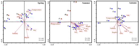 Ordination diagram of canonical correspondence analysis (CCA) exhibits phytoplankton community and environmental variables (arrows) during summer, spring, and autumn in the BS and NYS. A-O indicates the top 15 dominant species in each season listed in Table 2, the red triangles are Pyrrophyta and the blue triangles are Bacillariophyta.