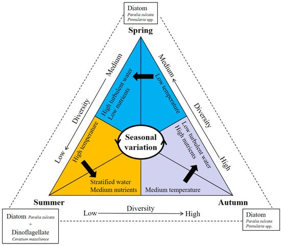 Phytoplankton communities in the BS and NYS are mainly dominated by diatoms, dinoflagellates, and chrysophytas, with diatoms dominating throughout the three seasons and dinoflagellates only dominating in spring and summer (Table 2). In addition, dinoflagellates show a lower occurrence frequency in spring than in summer and autumn. This finding is consistent with previous studies [36,37,38] that diatoms are the dominant phytoplankton group in almost all sampling stations, especially in spring and autumn. Several studies have shown that the combined effects of several environment parameters including nutrients, salinity, temperature, and depth, control the abundance and composition of the phytoplankton in different seasons (Figure 9) [39,40,41]. A simple scenario for seasonal succession patterns of the phytoplankton community in the BS and NYS is proposed here (Figure 10). Research data have revealed that nutrients show a strong seasonal variation due to the differences of terrestrial inputs, phytoplankton uptake, turbulent mixing, transformation and release from organic matter decomposition in BS in different seasons [42]. In spring, seawater mixes evenly due to the low temperature throughout the research area. Besides, the low nutrient concentrations especially the N-compounds caused by uptake are not suitable for the growth and reproduction of all kinds of algae, thus the species diversity is low (Table 4). The temperature rises in the summer and the seawater stratification become obvious, causing growth and reproduction of dinoflagellates. Although the overall cell abundance of phytoplankton increases, the diversity of the community does not increase, and is lower than that in spring (Table 4). In autumn, the concentrations of nutrients increase owing to the disturbance and organic matter decomposition and the temperature begins to decrease [42]. High nutrient levels and a suitable temperature allowed diatoms to grow and reproduce, and the diversity of the community increased significantly. In conclusion, the nutrients levels in different degrees of stratified seawater caused by different temperature in different seasons are the main controlling factor for the phytoplankton communities in the BS and NYS.