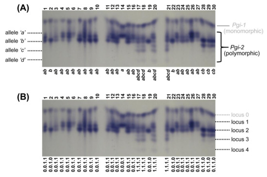 Zymogram of the PGI (phosphoglucoisomerase) enzyme in 30 individuals (mostly collected from El Labrado subpopulation) of Centaurea tentudaica, where two allozyme loci are identified (the faster-migrating Pgi-1, monomorphic, and the slower-migrating Pgi-2, polymorphic). The two approximations that are explained in Section 2 to interpret the banding patterns are outlined here ((A) treating the data as codominant; (B) treating the data as dominant). Through the first approach, up to four alleles can be identified for the Pgi-2 (‘a’, ‘b’, ‘c’, and ‘d’). As we were not able to estimate the allele dosage (that is, the number of copies of each allele) in all the individuals, we assigned ‘allele phenotypes’ (indicated at the bottom of the zymogram) instead of true genotypes. Please note that individuals 3–13 are all codified as ‘ab’, but they might actually correspond to different genotypes: Individuals 7, 9, and 10 could be ‘aabbbb’ or ‘abbbbb’ but, instead, individuals 4, 5, and 12 are probably ‘aaabbb’ or even ‘aaaabb’. Through the second approach, each of the four alleles that can be identified in the Pgi-2 is treated as a dominant locus, so if present, it is codified as ‘1′, if absent, as ‘0′. Hence, an individual that in the upper part of the graph is codified as ‘ab’, in the lower part of the graph is codified as ‘0.0.1.1′, while an individual with an allele phenotype ‘abcd’ would be ‘1.1.1.1′.
