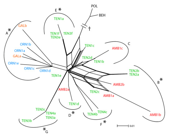 Neighbor-Net for the AGT1 region of Centaurea tentudaica. Letters correspond with the clades, shown in Figure S2. * indicates the statistically supported clades in the Bayesian analysis with a posterior probability above 0.90. † = 0.029.