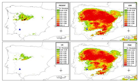 Potential distribution of Centaurea amblensis at present, Last Glacial Maximum (LGM), Last Interglacial Period (LIG), and Penultimate Glacial Maximum (PGM) conditions. Shaded areas indicate the probability of presence according to the scale of color shown in the figure. Black dots represent the locations used to construct the model. The solid black line indicates the coastline of the Iberian Peninsula at the two glacial maxima (LGM and PGM). The blue triangle represents the actual population of Centaurea tentudaica.