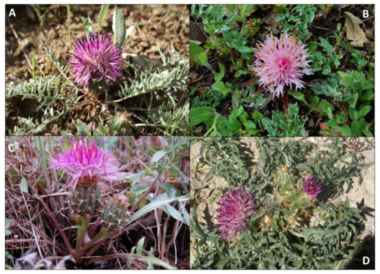 (A) Centaurea tentudaica with dark pink florets and acaulescent habit and purple anther tubes; (B) Centaurea tentudaica with pale pink florets and orange anther tubes; (C) Centaurea tentudaica with leaves similar to C. cephalariifolia and caulescent habit; (D) Centaurea amblensis. Photos: (A–C) Alfonso Susanna; (D) Francisco Márquez.