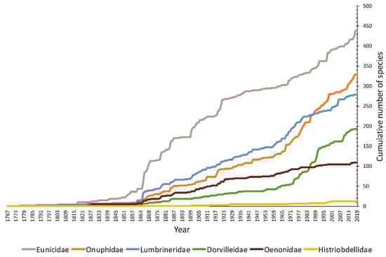 Cumulative number of species described in six eunicidan families, data on valid species only [15] (Hartmaniellidae not shown).