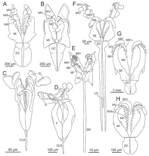 Diversity of maxillae in Eunicida. (A) Hartmaniella sp., Hartmaniellidae; (B) Augeneria sp., Lumbrineridae; (C) Ophryotrocha mammillata Ravara et al., 2015, Dorvilleidae, P-type maxillae; (D) the same, K-type maxillae (E) Histriobdella homari Van Beneden, 1858, Histriobdellidae; (F) Arabella mutans (Chamberlin, 1919), Oenonidae; (G) Eunice roussaei Quatrefages, 1866, Eunicidae; (H) Paradiopatra fragosa (Ehlers, 1887), Onuphidae. CLS—carrier-like structure, D—free denticles, DC—dorsal carrier, DR—dorsal rod, F—forceps, MIII-L—left maxillae III, MI–MV—maxillae I–V, VC—ventral carrier. (C–D) modified from Ravara et al. [31]; (H) modified from Budaeva and Fauchald [32].