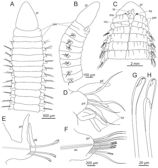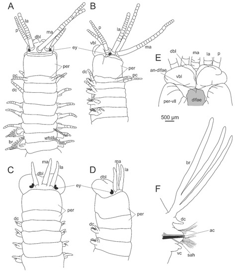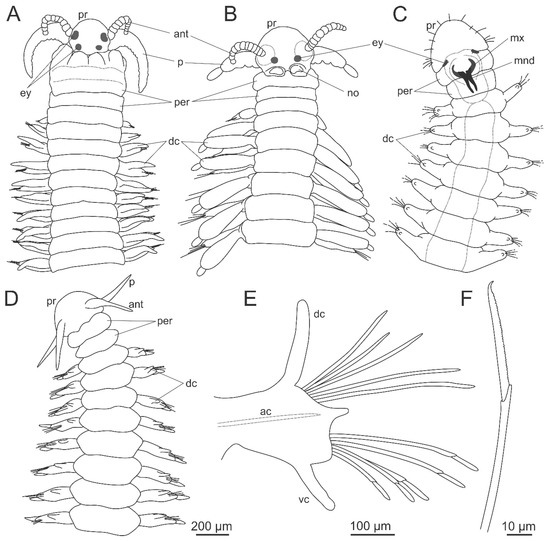 Morphology of Dorvilleidae. (A), (B) Dorvilleidade gen. sp. anterior end, dorsal view; (C) Ophryotrocha sp. Anterior end, dorsal view; (D) Ophryotrocha langstrumpae Wiklund, Altamira, Glover, Smith, Baco and Dahlgren, 2012, anterior end, dorsal view; (E) the same, midbody parapodium; (F) the same, compound chaeta. ac—acicula, ant—antenna, dc—dorsal cirrus, ey—eye, mnd—mandibles, mx—maxillae, no—nuchal organ, p—palp, per—peristomium, pr—prostomium, vc—ventral cirrus. (D–F) modified from Wiklund et al. [74].
