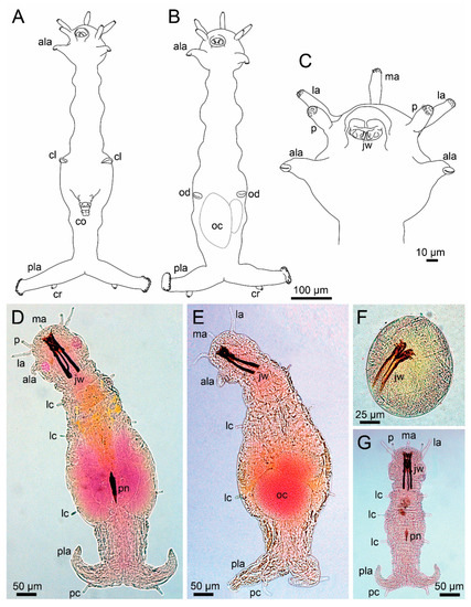 Morphology of Histriobdellidae. (A) Histriobdella homari, male, ventral view; (B) the same, female, ventral view; (C) the same, anterior end, ventral view; (D) Stratiodrilus arreliai Amaral and Morgado, 1997, male, ventral view; (E) the same, female, ventral view; (F) the same, early embryo; (G) the same, juvenile, ventral view. ala–anterior locomotory appendage, cl–clasper opening, co–copulatory organ, pc–posterior cirrus, jw–jaws, la–lateral antenna, lc–lateral cirrus, ma–median antenna, oc–oocyte, od–oviduct opening, p–palp, pla–posterior locomotory appendage, pn–penis. (D–G), Copyright © 2016, Editora Guanabara Koogan (Fransozo, A. & Negreiros-Fransozo, M.L., Zoologia dos Invertebrados, 1st edition, page 366), reproduced with permission of the publisher.