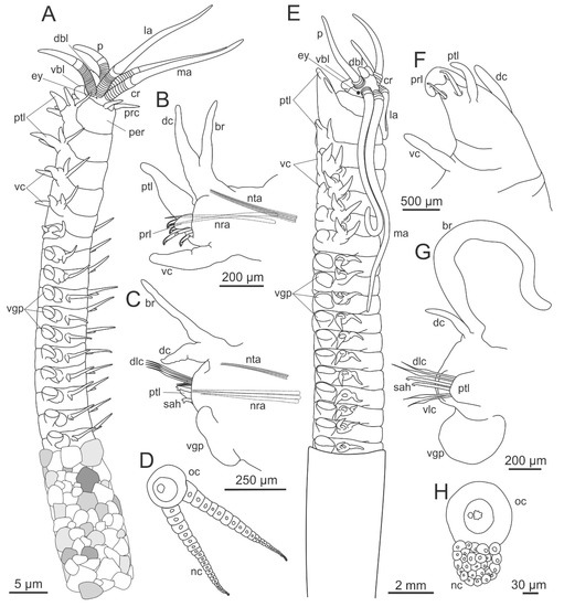- Uebelacker, J.M. Family Arabellidae Hartman, 1944. In Taxonomic Guide to the Polychaetes of the Northern Gulf of Mexico. Final Report to the Minerals Management Service, Contract 14-12-001-29091. Volume VI; Uebelacker, J.M., Johnson, P.G., Eds.; U.S. Department of the Interior Mineral Management Service Gulf of Mexico OCS.: Mobile, Italy, 1984; pp. 42.1–42.29. [Google Scholar]