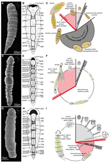 General external morphology, nervous system architecture and life cycle pattern of representatives of each of the three genera within Dinophilidae. (A–C). Dinophilus vorticoides (Faroe Islands); (D–F) Trilobodrilus axi (Sylt, Germany), (G–I) female Dimorphilus gyrociliatus. (A,D,G) Scanning electron micrographs illustrating external ciliation patterns (small crosshairs indicating orientation); (B,E,H) schematic reconstruction of the nervous system based on immunohistochemical labelling with anti-acetylated α-tubulin and confocal laser scanning microscopy (CLSM) in ventral view; (C,F,I) schematic summary of the life cycles of D. vorticoides, T. axi and D. gyrociliatus based on literature review and personal observations, developmental time given in days post deposition (dpd). Abbreviations: a, anterior; acom, anterior commissures; ans, angled segmental nerve; br, brain; cb, ciliary band; cec, circumesophageal connective; com, commissure; d, dorsal; dlln, dorsolateral longitudinal nerve; dln, dorsal longitudinal nerve; drcc, dorsal root of the circumesophageal connective; l, left; lln, lateral longitudinal nerve; mcom, median commissure; mvn, medioventral nerve; nacb, nerve anterior to the ciliary band; ncb, nerve of the ciliary band; nis, intersegmental nerve; no, nuchal organ; npcb, nerve posterior to the ciliary band; ns, segmental nerve; p, posterior; pcb, prostomial ciliary band; pcc, prostomial compound cilia; pcom, posterior commissure; pmvn, paramedian nerve(s); r, right; tcom, terminal commissure; v, ventral; vlln, ventrolateral longitudinal nerve; vlnc, ventrolateral nerve cord. Images modified from [26,79].
