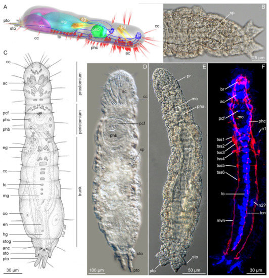 (A) Schematic illustration of Diurodrilus sp. from South Australia, Australia; (B) light micrograph of posterior trunk of D. subterraneus male with sperm. (C) Drawing of Diurodrilus sp. from Queensland, Australia, ventral side. (D) Light micrograph of male Diurodrilus sp. from Aomori, Japan. (E) Light micrograph of female D. subterraneus. (F). Confocal laser scanning microscopy (CLSM), maximum intensity projection of Z-stack images of D. subterraneus showing anti-acetylated α-tubulin like immunoreactivity (LIR) (blue) and anti-serotonin LIR (red). (C,E,F)—modified from [25]. Abbreviations: ac, anterior head ciliophore; anc, anal ciliary field; br, brain; cc, compound cilia; eg, esophageal gland; en, enteronephridium; hg, hindgut; mg, midgut; mo, mouth opening; mvn, main ventral nerve; n1–2, nephridium 1 and 2; pcf, prepharyngeal ciliary field; pg, prostomial gland; pha, pharynx; phb, pharyngeal muscle bulb (bowl-shaped); phc, peripharyngeal ciliophore; pr, prostomium; pto, primary toe; oo, oocyte; oon, oocyte nucleus; sp, spermatozoa; sto, secondary toe; stog, secondary toe gland; stg, stomatogastric ganglion; tc, trunk ciliophore; tcn, trunk ciliophore nerve; tss1–6, first to sixth pairs of trunk anti-serotonin LIR somata.