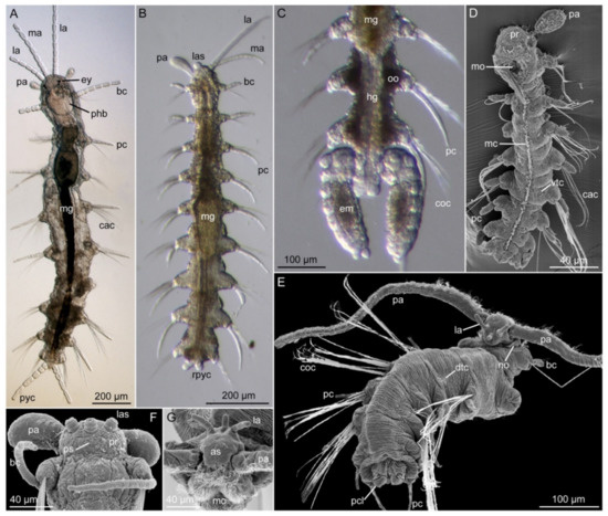 - Pierantoni, U. Observazioni suilo sviluppo embrionale e larvale del Saccocirrus papillocercus Bobr. Mitt. Zool. Stat. Neapel 1906, 18, 46–72. [Google Scholar]
