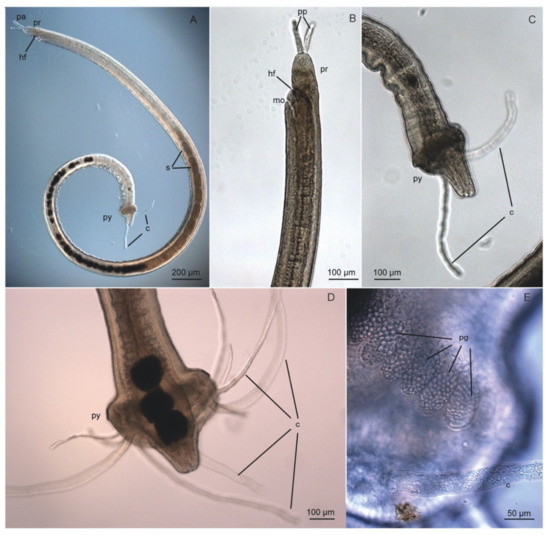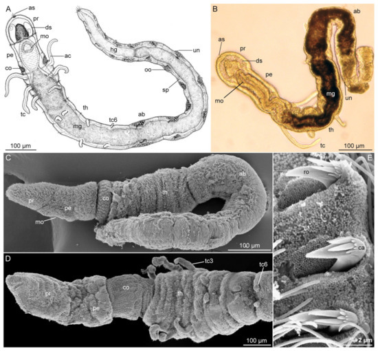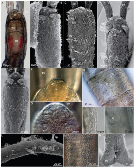 Morphological identification requires combined light and electron microscopical observations, often at high magnification. Differential interference contrast (DIC) helps when examining epidermal structures such as cilia and glands, whereas phase contrast enhances hard structures such as jaws, chaetae, stylets, and scales. Description of coloration, glandular structures or epidermal patterns, as well as some internal structures (e.g., nephridia), demands observations on live individuals. External ciliary structures (i.e., ciliary bands, ciliary tufts) are better studied using scanning electron microscopy (SEM) [37,42,60], whereas internal ciliated structures such as nephridia and gonoducts are better revealed using confocal laser scanning microscopy (CLSM) and immunolabelling [42,61].