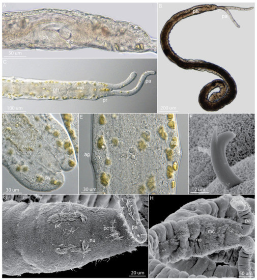 - Von Nordheim, H. Six new species of Protodrilus (Annelida, Polychaeta) from Europe and New Zealand, with a concise presentation of the genus. Zool. Scr. 1989, 18, 245–268. [Google Scholar] [CrossRef]
