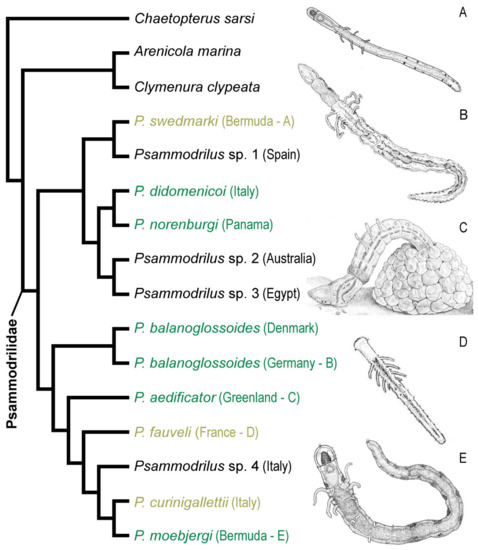 - Worsaae, K. Psammodrilidae Swedmark, 1952. In Handbook of Zoology; Purschke, G., Böggemann, M., Westheide, W., Eds.; De Gruyter: Berlin, Germany, 2019; pp. 143–155. [Google Scholar]