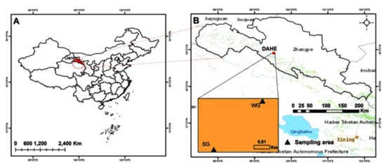 Figure 1. The experimental sitemap illustrating the location of Gansu Province in China (A) and the geographical locations of the summer (SG) and winter (WG) grazing pasture areas at Dahe, Sunan county in Gansu Province (B).