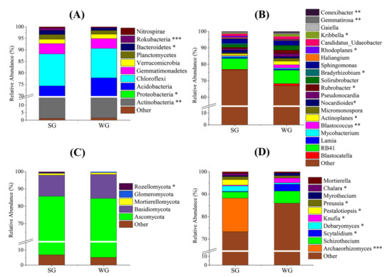 Figure 2. Relative abundances of dominant bacterial phyla (A), bacterial genera (B), fungal phyla (C), and fungal genera (D) between two different grazing scenarios—summer (SG) and winter (WG). Legends marked *, **, and *** are significantly different groups at p ≤ 0.05, p ≤ 0.01, and p ≤ 0.001, respectively.