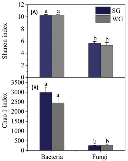 Figure 3. Microbial α-diversity differences in summer (SG) and winter (WG) grazing pastures. (A) Microbial evenness indicated by Shannon–Wiener index. (B) Microbial species richness indicated by Chao 1. Different lowercase letters indicate a statistical significance at p ≤ 0.5 within a microbial group.
