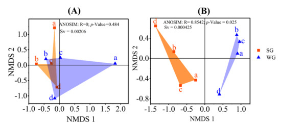 Figure 4. Non-metric multidimensional scaling (NMDS) plots to illustrate fungal (A) and bacterial (B) beta diversities as impacted by seasonal summer (SG) and winter (WG) grazing. Letters a, b, c, and d indicate replicates. Sv are stress values indicating the goodness of fit.