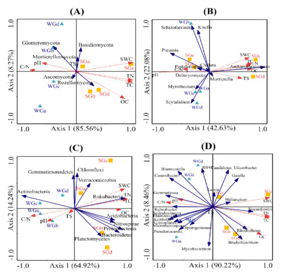 Figure 5. Redundancy analysis (RDA) demonstrating the relationships between dominant fungal phyla (A), fungal genera (B), bacterial phyla (C), and bacterial genera (D) and soil properties. The two axes (Axis 1 and 2) explain the microbial community and soil properties variation between SG and WG pastures. Solid blue and dashed red vectors indicate the microbial taxa and soil parameters, respectively. Yellow squares and blue triangles represent the SG and WG pastures, respectively.