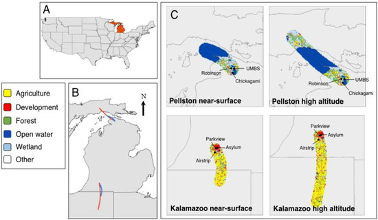 In winter 2016–2017, we collected airborne samples at three sites near Pellston, in northern Michigan, located in Emmet and Cheboygan counties and at three sites in Kalamazoo County, in southwest Michigan, USA (Figure 1, Tables S1 and S2). We worked with land owners to select sites that had sufficiently large open areas to safely fly each of three 4.8-m diameter helikites at an altitude of 150 m for six hours, which is the maximum altitude allowed by the United States Federal Aviation Administration (FAA) for tethered flight vehicles [40]. We calculated land cover information surrounding 10,000 m of each site using the National Land cover database in ArcGIS 10.6.1 [41]. Sites near Pellston, which we call the “undeveloped location”, were predominantly forested (31.6%) and wetland (18.6%) land covers (Table S1). The sites near Kalamazoo, which we call the “developed location”, were predominantly surrounded by agricultural (42.3%) and developed (25.9%) land uses (Table S1). We sampled at the three developed sites (Parkview Campus, Asylum Lake Preserve and Schoolcraft Airstrip) on 23 December 2016. We sampled at two undeveloped sites (University of Michigan Biological Station (UMBS) UVB Field and Robinson Road) on 13 January 2017; due to time constraints, we sampled at the third undeveloped site (Chickagami Trail) on 14 January 2017.