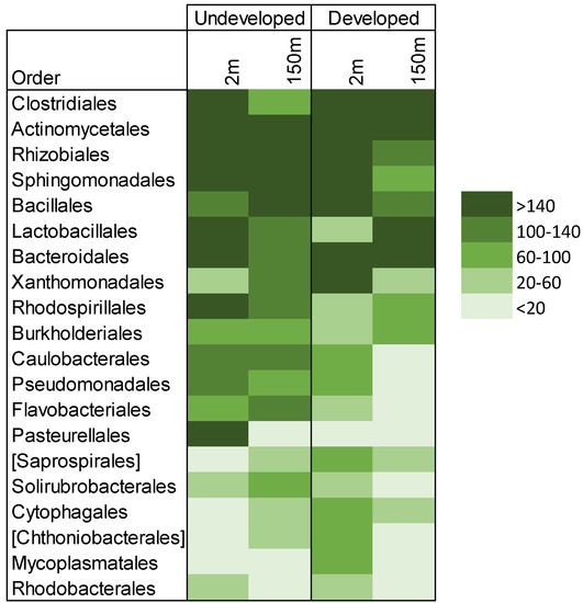 Specific percentages of land uses over which the air masses traveled are shown in Table S3. When all samples were considered together, land use explained 57% of the variation in airborne bacterial communities (p = 0.043). Altitude only explained eight percent of the variation in airborne communities, which was not significant (p = 0.701, Figure S3). OTU richness was significantly higher (p = 0.05) at the undeveloped location (635 ± 299) than at the developed location (251 ± 52). Phylogenetic diversity was marginally higher (p = 0.09) at the undeveloped location (30.05 ± 12.68) than at the developed location (16.60 ± 2.12). The five most abundant bacterial orders across all twelve air samples were Clostridiales (17%), Rhizobiales (11%), Actinomycetales (10%), Sphingomonadales (9%) and Bacillales (5%). Sphingomonadales (Wilcox p = 0.019) and Pasteurellales (Wilcox p = 0.030) were significantly more abundant in samples collected at the undeveloped location than at the developed location (Figure 2). Other major orders did not significantly differ between the two locations; however, some prominent orders (Bacillales, Caulobacterales and Flavobacteriales) were more abundant at the undeveloped location, though not significantly (Figure 2). At the family level, Sphingomonadaceae, Methylocystaceae and Pasteurellaceae were more abundant at the undeveloped location and Lachnospiraceae and Lactobacillaceae were significantly higher at developed location. Average relative abundances for all bacterial orders are shown in Figure 3. Since it is well-established that airborne communities can differ by land use, the remainder of our results focus on differential patterns within each land-use type (i.e., undeveloped and developed).