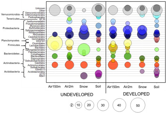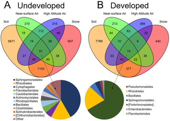 The relative abundances of the predominant orders in air, soil and snow samples are presented in Figure 3 for each location. Seventeen bacterial orders were present in all sample provenances from the undeveloped location and only seven orders were present in the developed location (Figure 5). We examined the order-level composition of the taxa shared by all four provenances in each location. Rhizobiales and Bacillales were abundant in both the undeveloped and developed locations (totals of 18.2% and 4.1%, respectively). However, Sphingomonadales contributed most to the shared community (42%) in the undeveloped location, while Pseudomonadales predominated the shared community (67%) at the developed location (Figure 5).