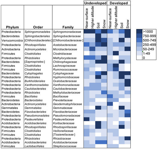 We explored this further using a heatmap approach to examine which families were shared most frequently in all provenances (Figure 6). In the undeveloped location, OTUs within Sphingomonadaceae were shared in high abundances among all four sample provenances. Acetobacteraceae were also present in all provenances, but were most abundant in snow and soil, and then decreased in abundance from lower- to higher-altitude air. Many families were disproportionately abundant in soil and snow, indicating a potential lack of airborne dispersal in their life histories, such as Chitinophagaceae, Cytophagaceae, Chthoniobacteraceae and Acidobacteriaceae. Conversely, OTUs within Pasteurellaceae and Microbacteriaceae were more abundant in airborne samples but were either absent or in low abundance in soil and snow. There were several similarities at the developed location. Sphingomonadaceae were also shared by all sample provenances at the developed sites, and the same four orders were disporporationately present in soil and snow. In contrast, Clostridiaceae were most abundant in higher-altitude air samples and Rhizobiaceae, Xanthomonadaceae and Oxalobacteraceae were abundant in snow samples only. While it is not possible to determine whether these communities act as sources or sinks, our results provide evidence that land use affects connectivity between soil, snow and airborne bacterial communities, notably at higher altitudes. Homogenous, higher-altitude communities that traveled over developed land carried more OTUs representative of anthropogenic sources and exhibited less overlap with near-surface atmospheric and terrestrial communities.