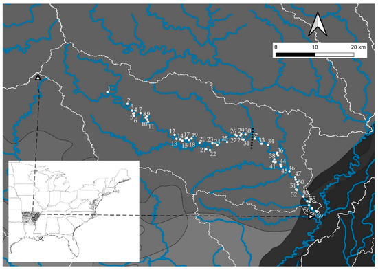 In order to ensure geographical coverage, we used a total of 59 headwater-to-mouth sites that were sampled between 1983 and 2016 (Figure 1) with seven sites from the 1980s (3, 8, 14, 26, 44, 48, and 54 ), 32 sites from the 1990s (4–7, 9–13, 15–20, 27–42, 52), 18 sites from the 2000s (1–2, 21–25, 45–48, 49–51, 53, 55–57, and 59), and two sites from the 2010s (43 and 58). A total of 57 sites were collected using qualitative methods and two sites (51 and 52) were collected using semi-quantitative methods. Qualitative methods consisted of searching the stream, based on walk-in or canoe access, from bank to bank in a zig-zag pattern by two or more surveyors in which mussels were visually located and collected by hand through a recorded amount of time. The two semi-quantitative survey sites results were obtained through 1 m2 quadrat sampling in highest density areas within a sampling reach [15,16]. All live and fresh dead individuals were identified in the field, enumerated, and most returned to the sampling area from where they were collected. Live and dead collected voucher specimens for most species are being curated into the Arkansas State University Museum of Zoology.