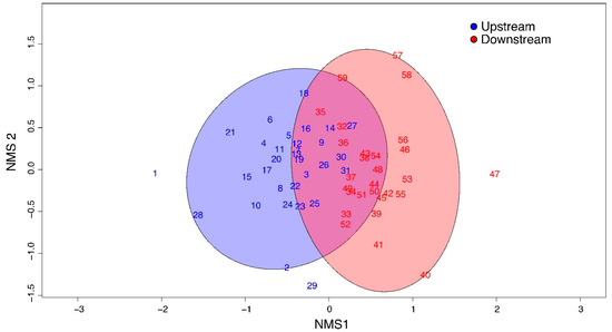 The NMS analysis revealed a geographic pattern of two clusters representing an upstream assemblage group from sites 1–31 and a downstream assemblage group from sites 32–59 (Figure 2). The two groupings were significantly different based on the standard deviation of sites to their geographic group centroids (ANOSIM, R = 0.3931, p < 0.001). We created 95% confidence interval ellipses for each group centroid based on standard deviation (Figure 2). There are three sites (1, 29, and 47) which fall outside of their group’s 95% CI.