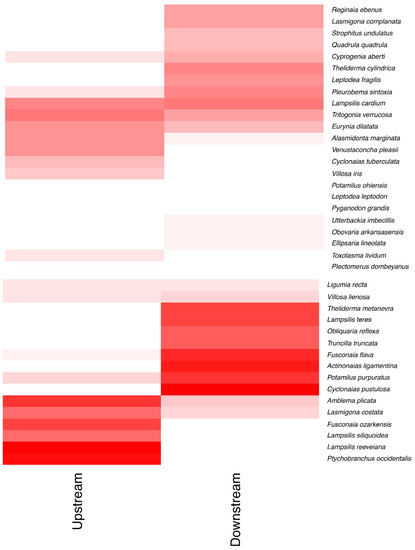 Heat map showing results of indicator species analysis for upstream and downstream mussel assemblage groups in the Strawberry River. Deeper red coloring indicates stronger indicator relationships within each group.