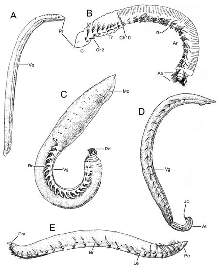 Stylized drawings of opheliids of the subfamily Opheliinae (B,C) and Ophelininae (A,D,E). (A) Polyophthalmus pictus in latero-ventral view; (B) Thoracophelia japonica in lateral view (chaetiger numbers mark limit between body regions); (C) Ophelia bicornis in lateral view; (D) Ophelina abranchiata in lateral view; (E) Armandia cirrhosa in lateral view. (A,C–E) redrawn after Parapar [4]; (B) modified after Misaka and Sato [22]. Abbreviations: Ab—abranchiate chaetigers; Ar—abdominal region; At—anal tube; Br—branchia; Ch—chaetiger; Cr—cephalic region; Le—lateral eye; Mo—mouth; Pd—pygidium dorsal papillae; Pe—prostomial subdermal eye; Pm—pygidium marginal papillae; Pr—prostomium; Tr—thoracic region; Uc—unpaired anal cirrus; Vg—ventral groove.
