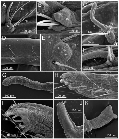 Parapar et al. [15] suggested that features of nuchal and lateral organs might represent useful characters to diagnose species in the future, in spite that the latter, for instance, can be easily overlooked or is difficult to examine due to state of preservation [2]. In this context, the use of SEM for examination of properly fixed specimens seems mandatory to fully assess features of parapodia, as well as nuchal and lateral organs (e.g., [2,58,60,62,63,68]).