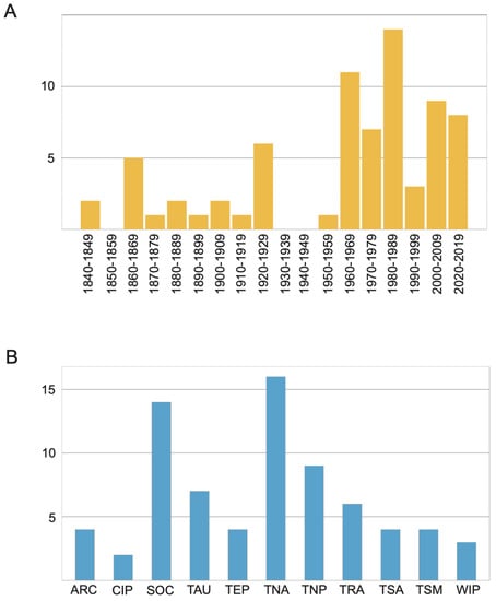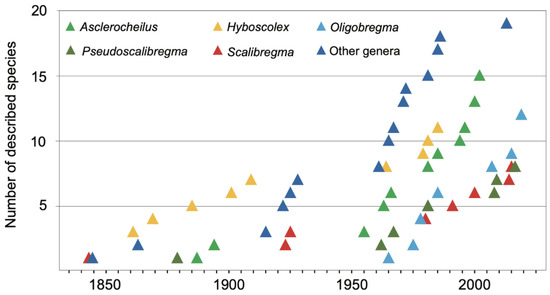 The study of Scalibregmatidae received a notable attention during the 19th century. By the beginning of the 20th century, many common European species were already described [30,106,107,108,109,110] including also a few species from Australia [111], New Zealand [112], Cuba [113], and South Africa [111] (Table A2). This level of attention did not decline during the 20th century, when new species of Scalibregmatidae were described nearly every decade (Figure 7A and Figure 8).