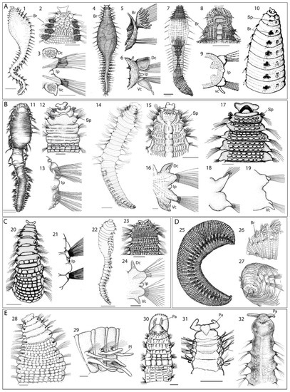 Stylized drawings showing the main taxonomic characters of different genera in Scalibregmatidae, artificially grouped according to the most conspicuous external traits. (A) Arenicoliform scalibregmatid genera with branchiae; genus Scalibregma, (1) S. hanseni, dorsal view, (2) S. inflatum, anterior end in dorsal view, (3) S. hanseni, left parapodium of chaetiger 21 in posterior view; genus Sclerobregma, (4) S. branchiatum, dorsal view, (5) chaetiger 3 in posterior view and (6) abdominal parapodium in anterior view; genus Cryptosclerocheilus, (7) C. baffinensis, dorsal view, (8) anterior end in ventral view; genus Parasclerocheilus, (9) P. capensis, chaetiger 40 and (10) anterior end in lateral view. (B) Arenicoliform scalibregmatids genera without branchiae and with spines; genus Asclerocheilus, (11) A. tasmanius, dorsal view, (12) A. kudenovi, anterior end dorsal view, (13) A. beringianus, chaetiger 15 in anterior view; genus Oligobregma (14) O. quadrispinosa, anterior view, (15) O. mucronata, anterior end in ventral view, (16) and posterior parapodium in anterior view; genus Sclerocheilus, (17) S. unoculus, anterior end in dorsal view, (18) chaetiger 16 in posterior view, and (19) chaetiger 29 in posterior view. (C) Arenicoliform scalibregmatid genera without branchiae and spines; genus Hyboscolex, (20) H. quadricincta, anterior end in dorsal view, (21) H. pacificus, median parapodium in anterior view; genus Pseudoscalibregma, (22) P. papilia, dorsal view, (23) P. usarpium, anterior end in dorsal view, (24) P. hartmanae, posterior chaetigers in anterior view. (D) Maggotlike scalibregmatids genera; genus Polyphysia, (25) P. crassa, lateral view and (26) anterior end in anterior view; genus Lipobranchius, (27), L. jeffreysi, frontal view. (E) Morphologically divergent genera; genus Scalibregmides, (28) S. peruanus, anterior end in dorsal view, (29) S. chilensis; genus Scalibregmella, (30) S. antennata, anterior end in dorsal view; genus Speleobregma, (31) S. lanzaroteum, anterior end in dorsal view; genus Axiokebuita, (32) A. minuta, anterior end in ventral view. Abbreviations: Br—branchiae; Dc—dorsal cirri; Ip—interramal papillae or ciliation; Pa—prostomial appendages; Pl—parapodial lobe; Sp—spines; Vc—ventral cirri. Modified from (1,3) Bakken et al. [35]; (2) Mackie [34], (4–6) Hartman [115], (7–8) Blake [116], (9–10) Day, [117], (11) Kirkegaard [118], (12) Blake [119], (13) Imajima [120], (14) Schüller and Hilbig [37], (15–16) Blake [36], (17–20) Kudenov [25], (21) Imajima [121], (22) Schüller [55], (23–24, 28–29) Blake [31], (25) Støp-Bowitz, [122], (26) Hartmann-Schröder [97], (27) Wesenberg-Lund [123], (30) Blake [23], (31) Bertelsen [124], (32) Parapar et al. [61].